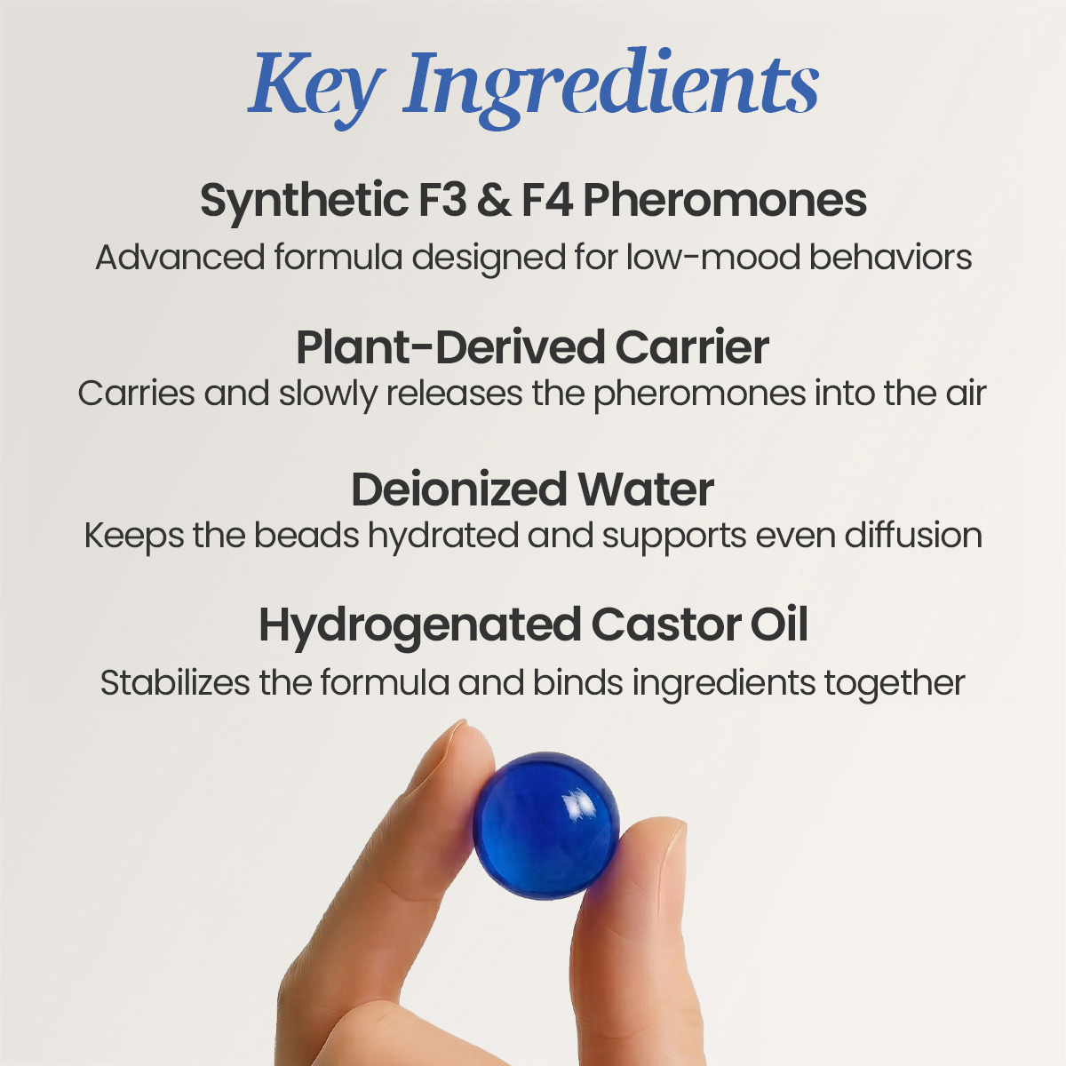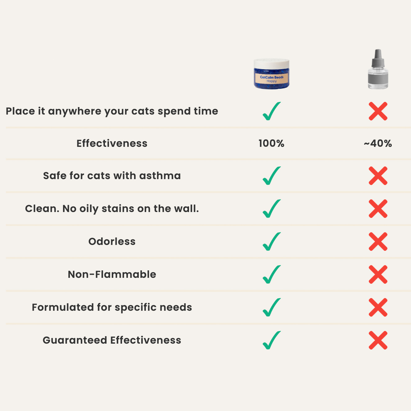 Unlike diffusers, CatCalm Happy uses gel bead technology to release the pheromones at room temperature, without any heat that would destroy the pheromone molecules before they even reach your cat. Place it freely around your home at your cat's favorite spots.