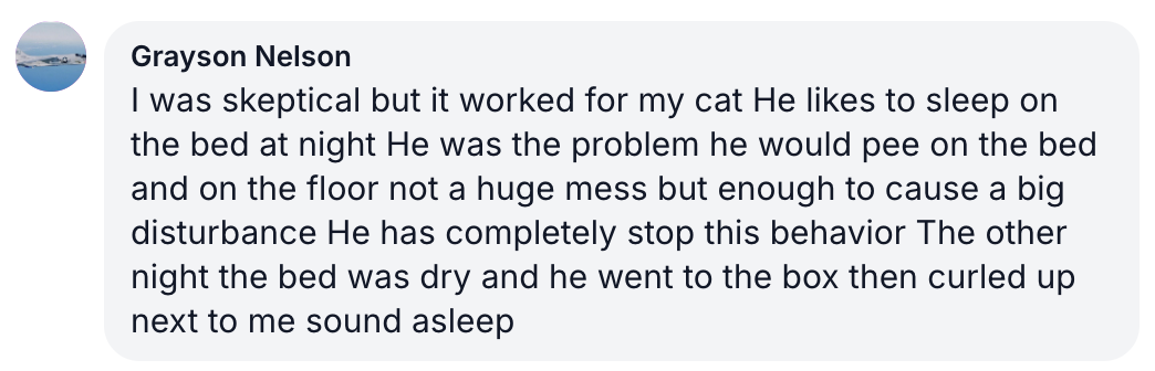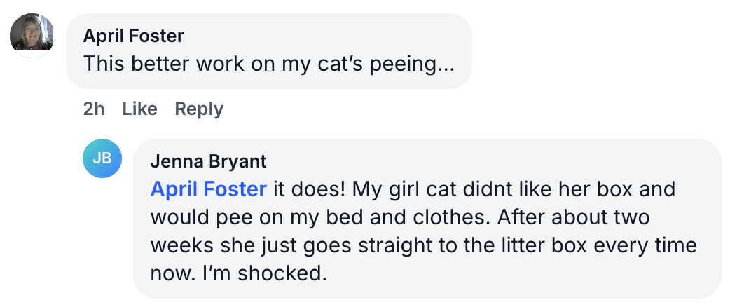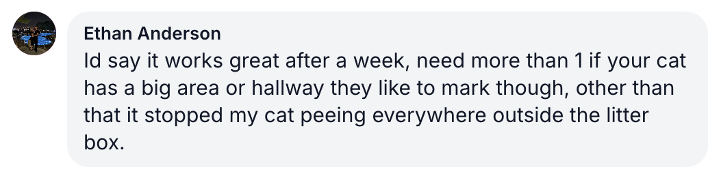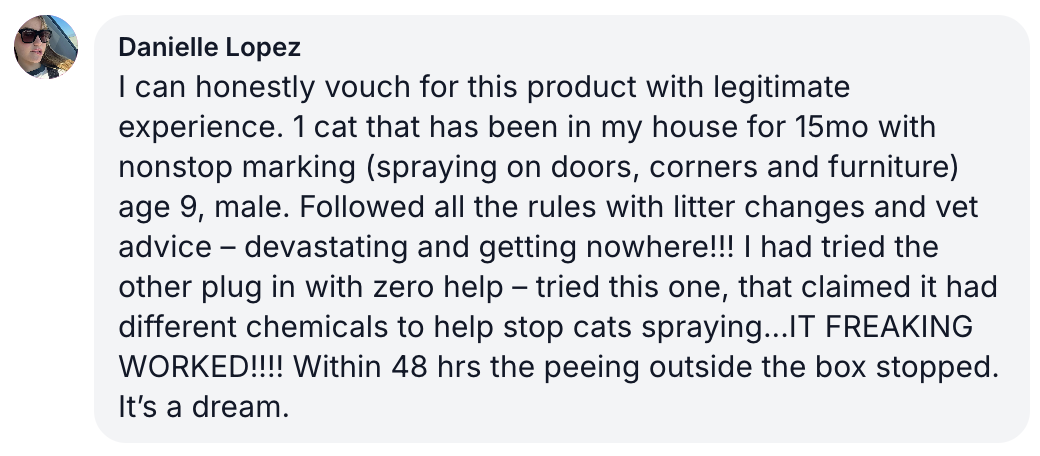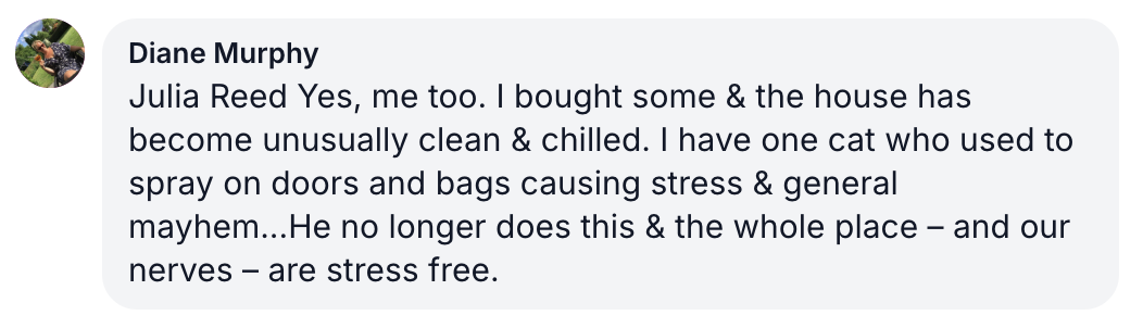 Spray 3 times daily on your cats’ favorite spots. Noticeable improvement in just 24 hours!