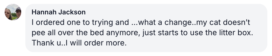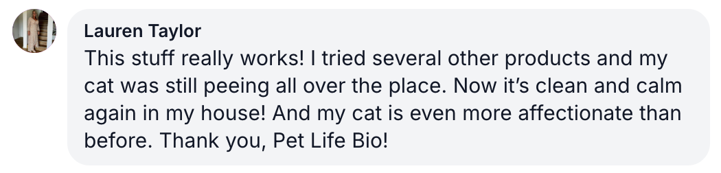 The spraying and urinating outside the litter box has completely stopped. The pungent smell disappears from your home. You receive compliments because your home smells so good. You no longer have to soak stains, and your furniture is safe.
