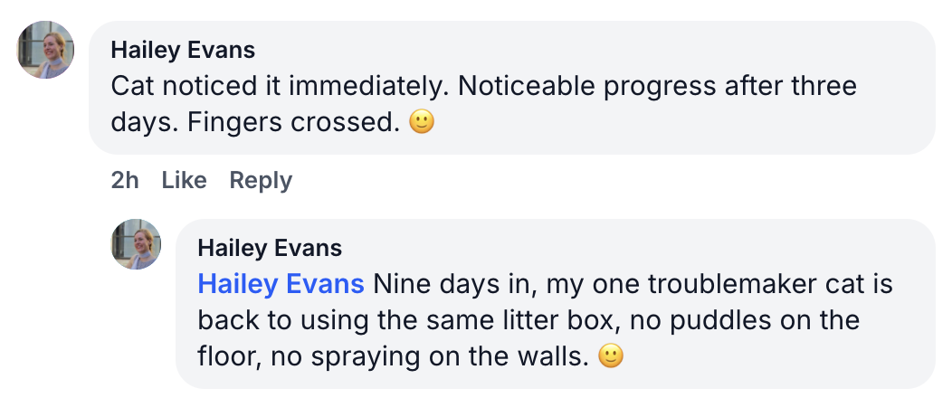 Most customers notice the first signs of improvement within 3 days — like less hissing, more tolerance, or fewer standoffs. By week one, the difference is usually clear. For long-term harmony, we recommend continuous use.