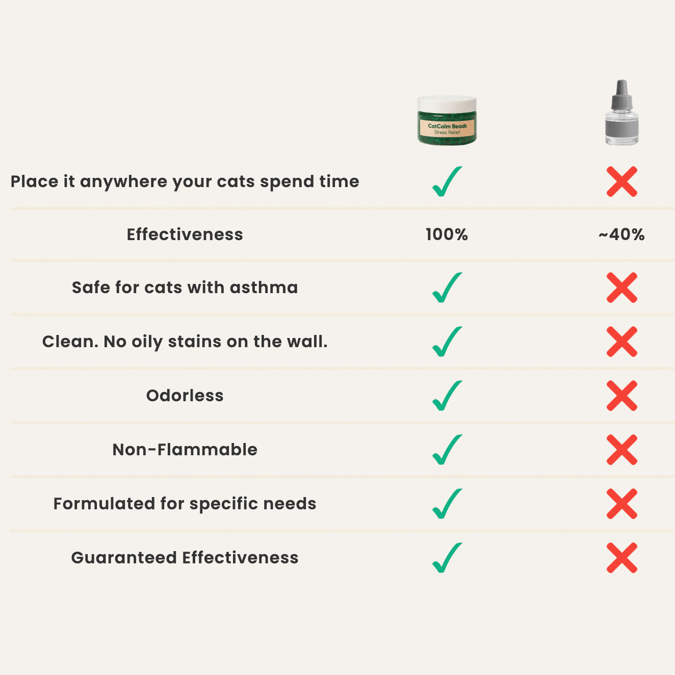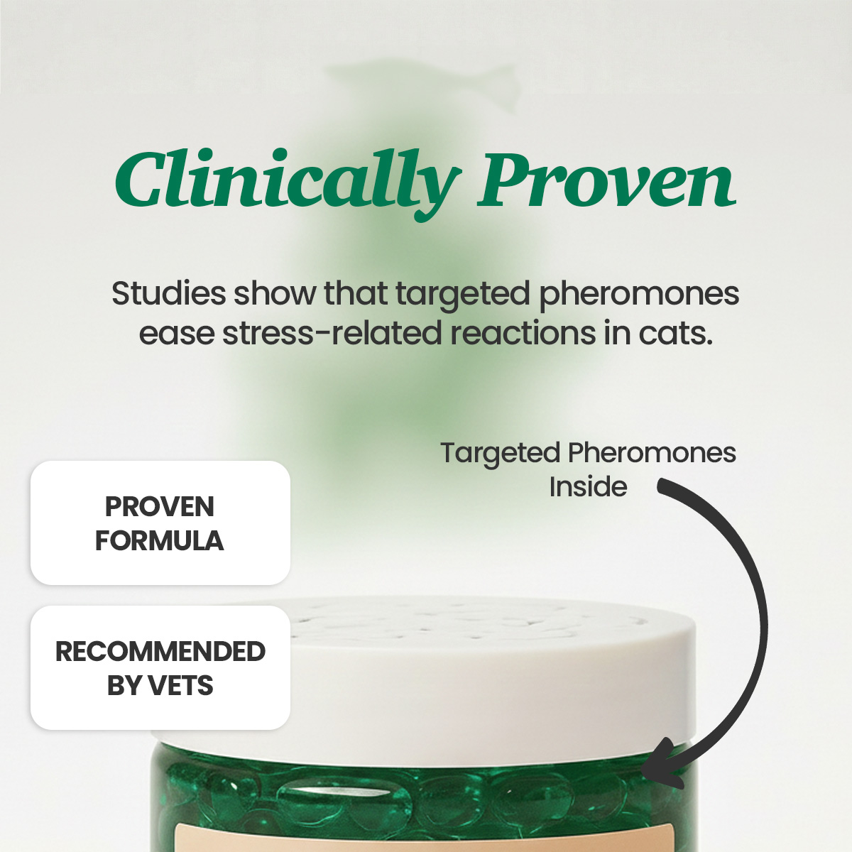 Unlike diffusers, CatCalm Stress Relief uses gel bead technology to release the pheromones at room temperature, without any heat that would destroy the pheromone molecules before they even reach your cat. Place it freely around your home at your cat's favorite spots.