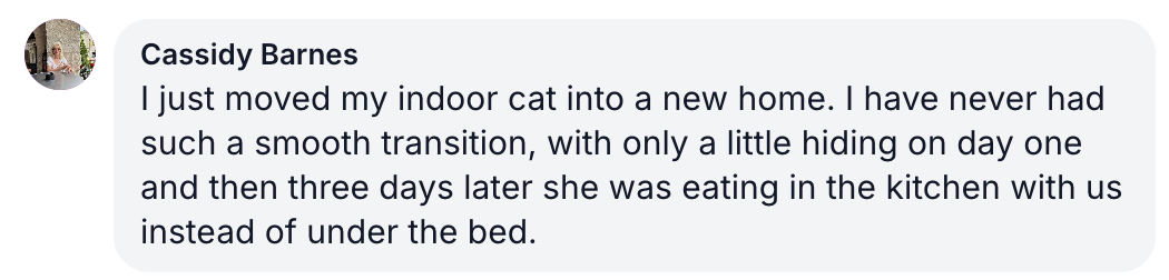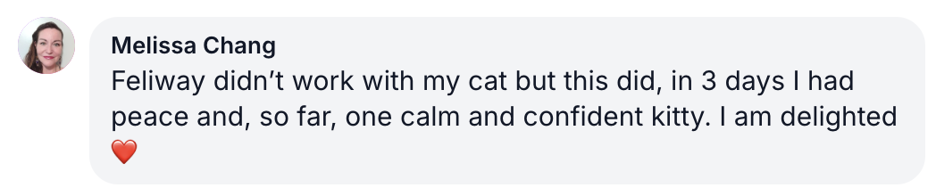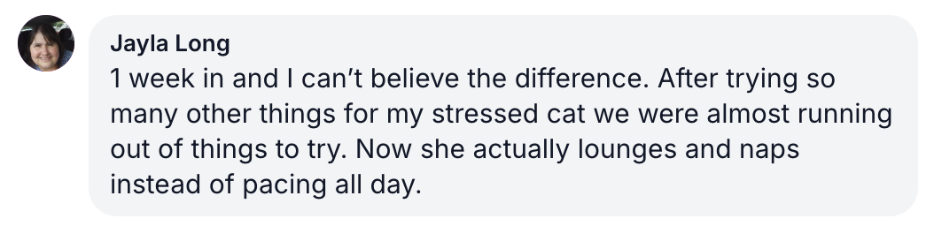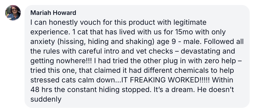 "In my 15 years as a veterinarian, I've had consistently great experiences with cat pheromones. They're completely natural, mimic cats' own calming signals, and have been clinically tested for over 30 years. I recommend them with a clear conscience because they're both safe and remarkably effective."