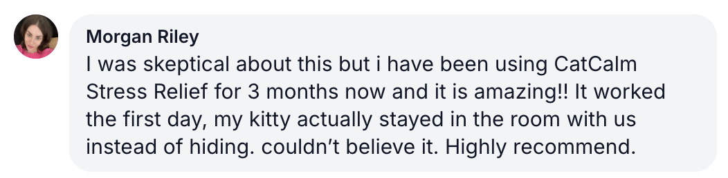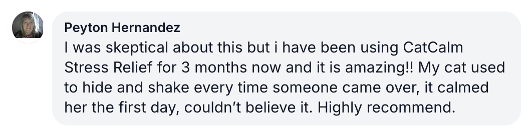 The stress is gone. Sometimes you cat might still hide when there is a loud noise or something unexpected. But it's clearly much better than before CatCalm Stress Relief.